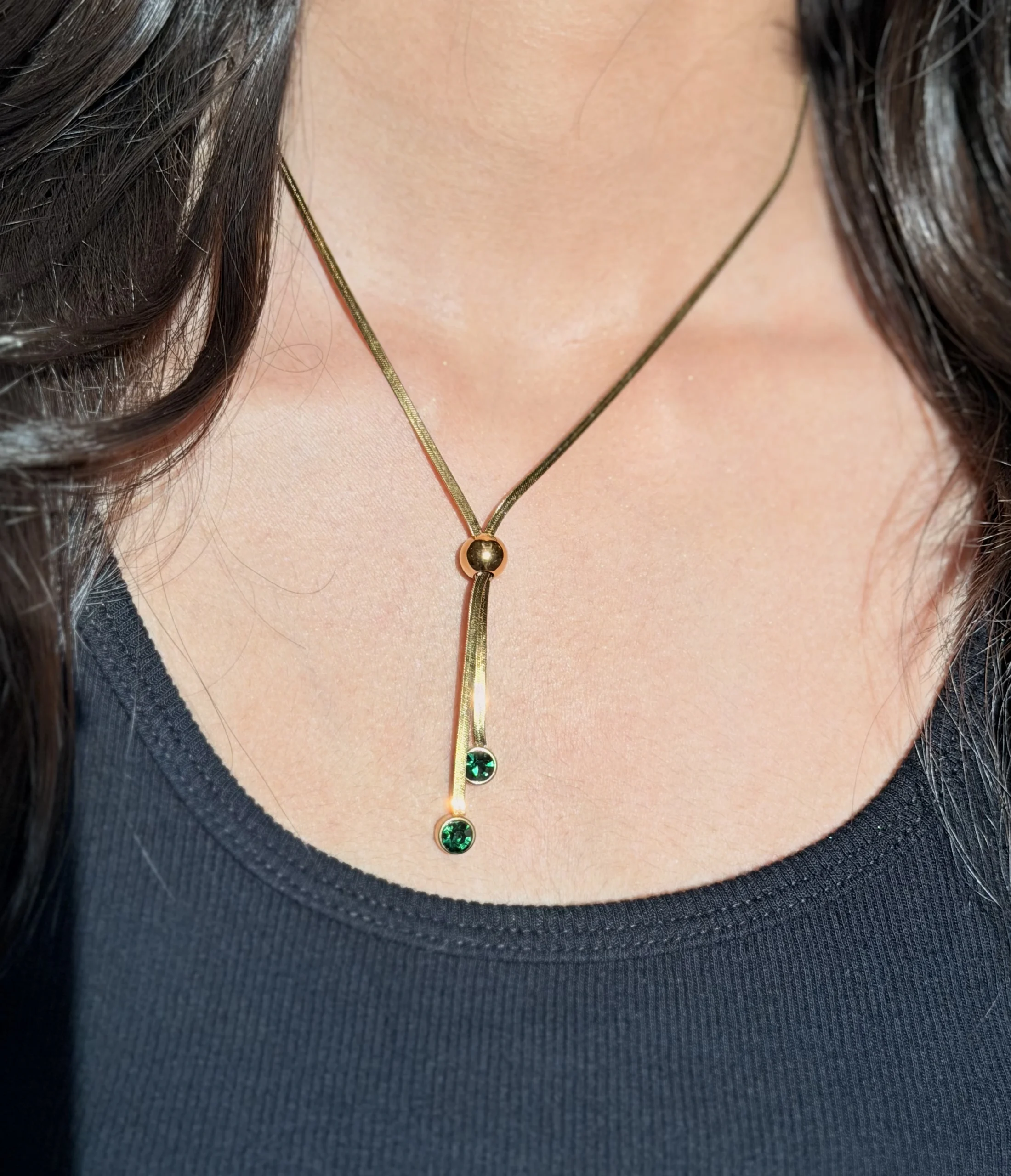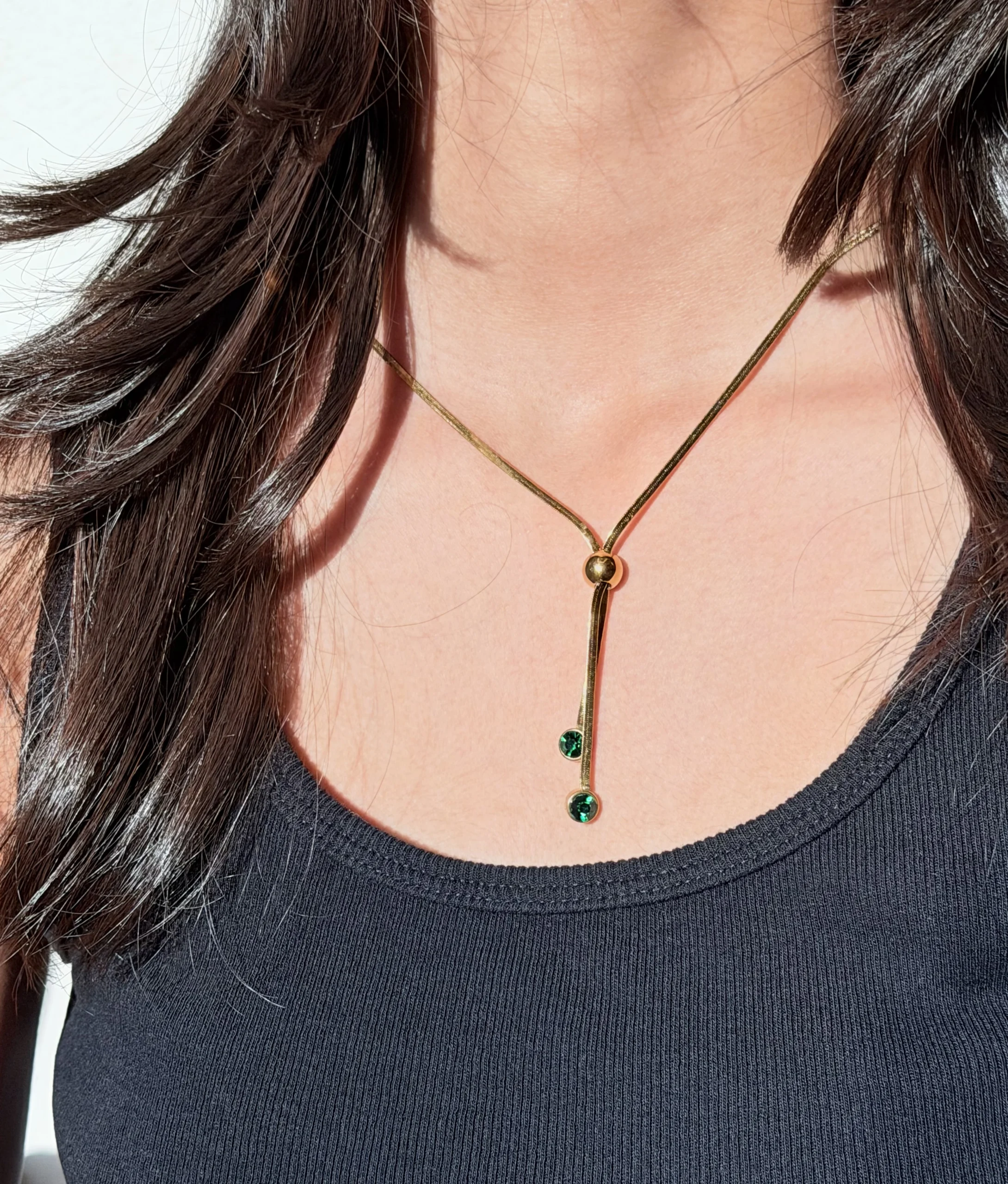Elevate your elegance with this stunning Emerald Drop Pull-Up Necklace. Featuring a lustrous emerald stone suspended from an adjustable pull-up style chain, this piece combines timeless sophistication with modern versatility.
