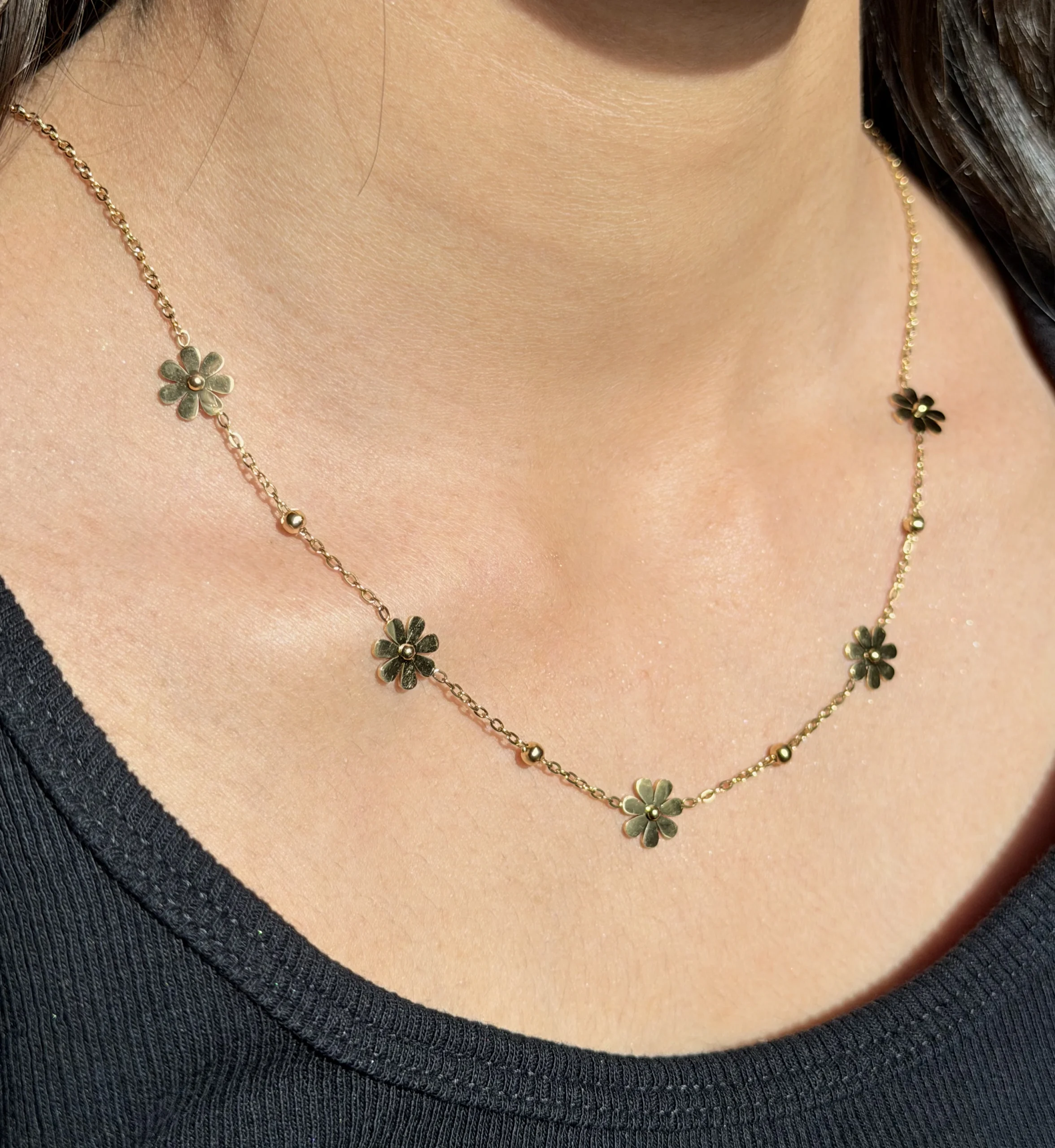 This gold-toned flower necklace is a playful yet dreamy statement piece, designed to capture and reflect light with every movement.