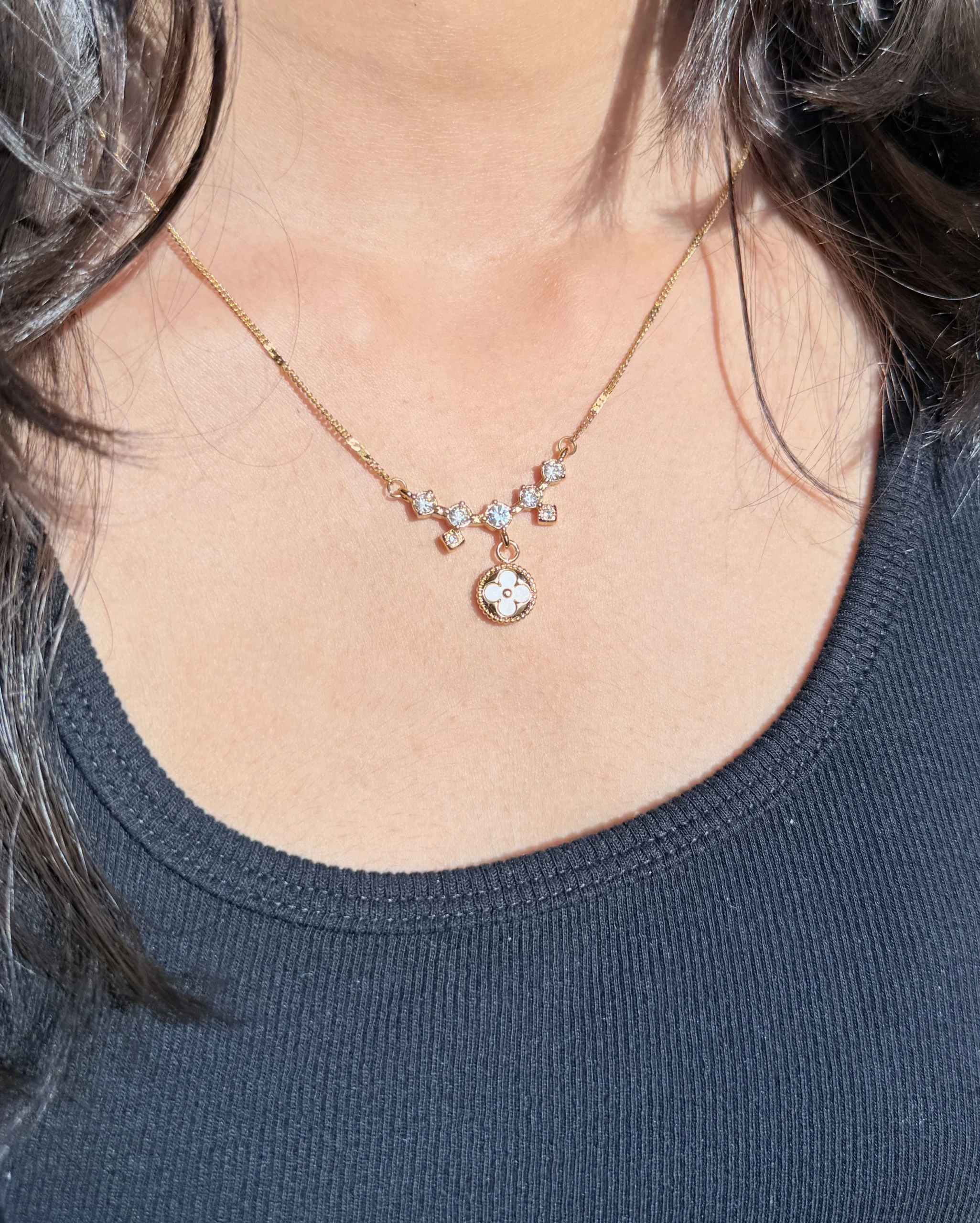 This charm drop necklace combines vibrant color with classic iconography to create a playful yet sophisticated statement piece. Available in both a multi-color gemstone and a classic clear crystal edition, it offers two distinct ways to brighten your jewelry collection.