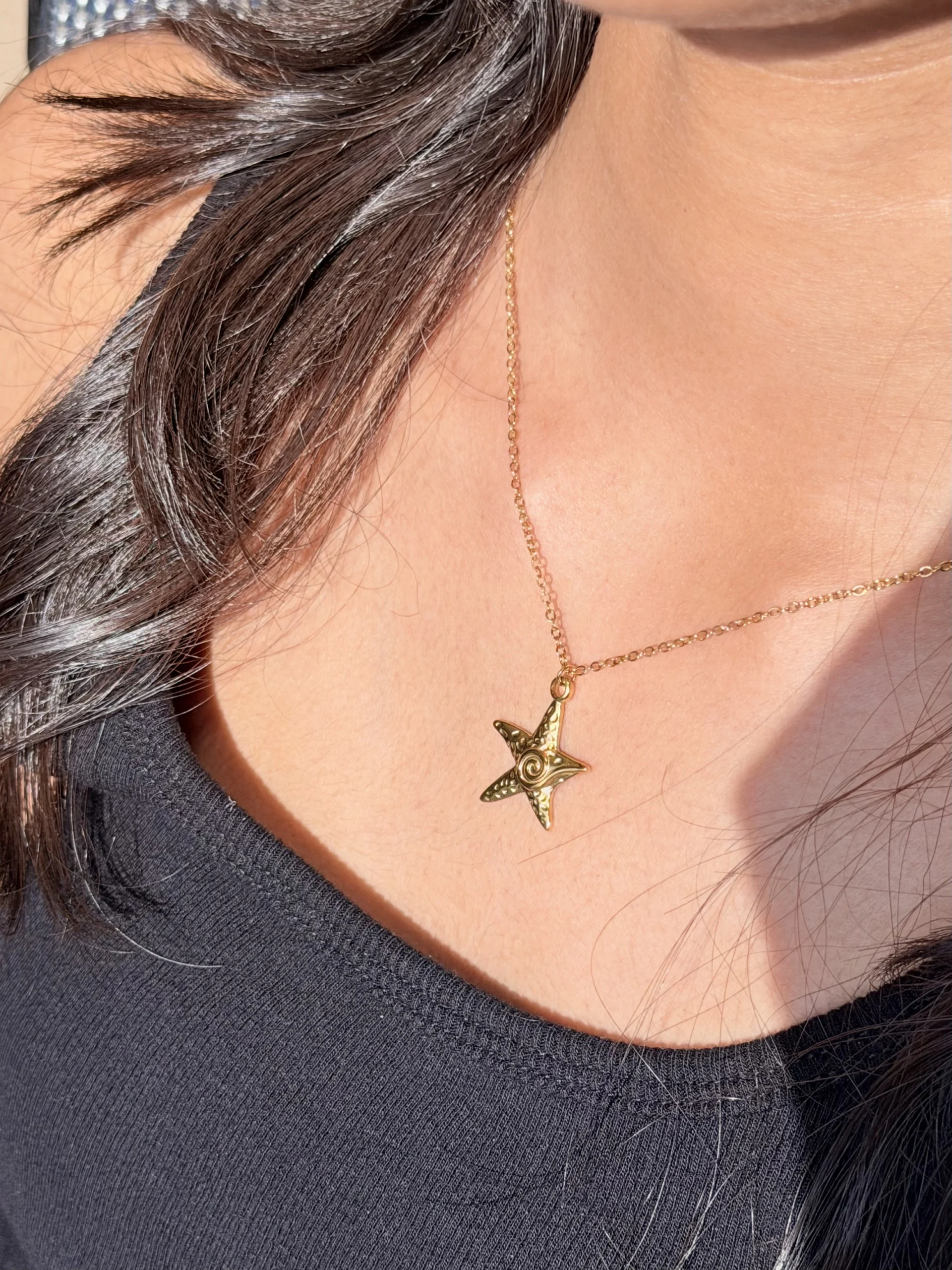 A delicate gold-toned necklace featuring a beautifully detailed starfish pendant Inspired by the beauty of the ocean, this piece adds a unique and elegant charm to your everyday look.